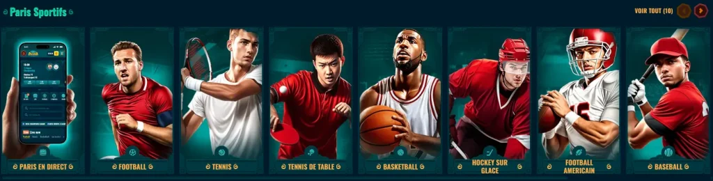 Une section dédiée aux paris sportifs permet de miser sur une large sélection d’événements populaires. Les joueurs peuvent parier sur le football, le tennis, le basketball et d’autres disciplines majeures, avec des cotes régulièrement mises à jour. L’interface est claire et réactive, facilitant la prise de paris en temps réel, aussi bien sur ordinateur que sur mobile, pour une expérience fluide et accessible.